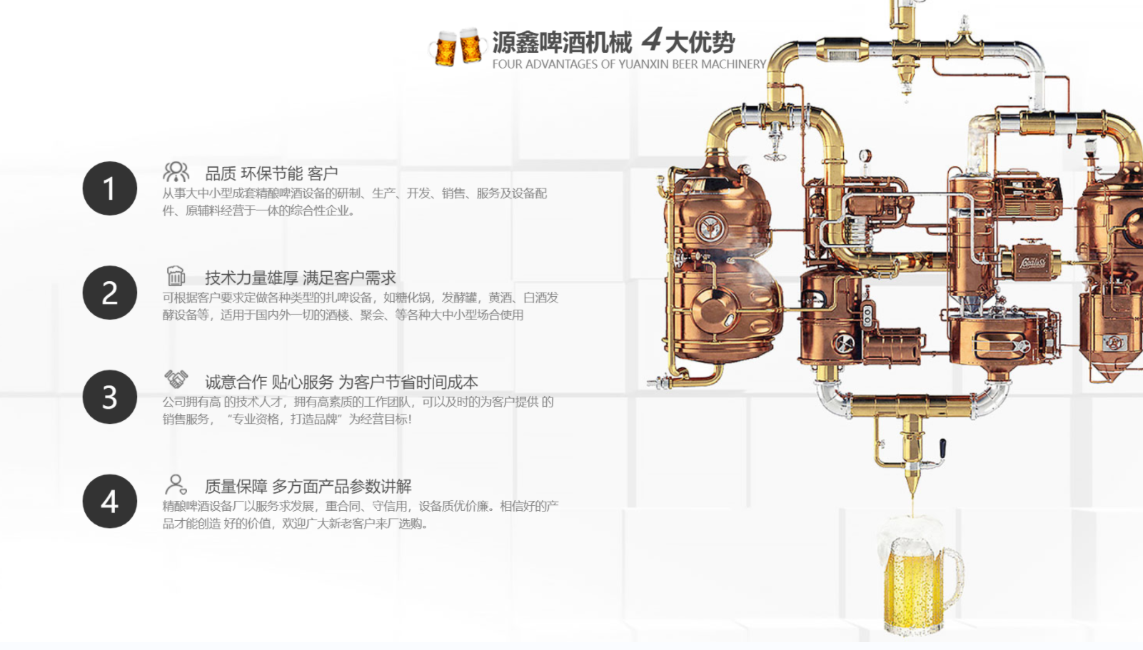 南陽市源鑫啤酒機械設備有限公司位于歷史文化名城一-南陽,從事大中小型成套啤酒、白酒自釀設備的研制、生產、開發、銷售、服務及設備配件、原輔料經營于一體的綜合性企業。公司可根據客戶要求定做各種類型的扎啤設備,如糖化鍋,發酵罐,黃酒、白酒發酵設備等,適用于國內外一切的酒樓、餐廳、家庭.聚會、酒吧等各種大、中、小型場合使用。公司擁有技術人才,擁有高素質的工作團隊,可以及時的為客戶提供**的銷售服務。公司以“專業資格,打造品牌”為經營目標,“卓越質量,信賴價格”為經營宗旨,以質量求生存,以服務求發展,重合同、守信用,設備質優價廉。相信好的產品才能創造 好的價值,歡迎廣大新老客戶來廠選購。...